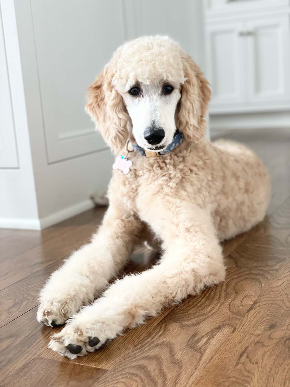 Evie is our one and only family pet and the sweetest Standard Poodle you’ll ever meet. She is four years old, AKC registered, and completely non-shedding. Evie is calm, loyal, and very gentle with our kids and other dogs, making her an ideal mom for this litter. She lives inside our home, spends every day with us, and has a loving personality.