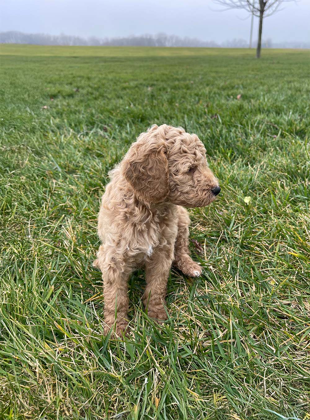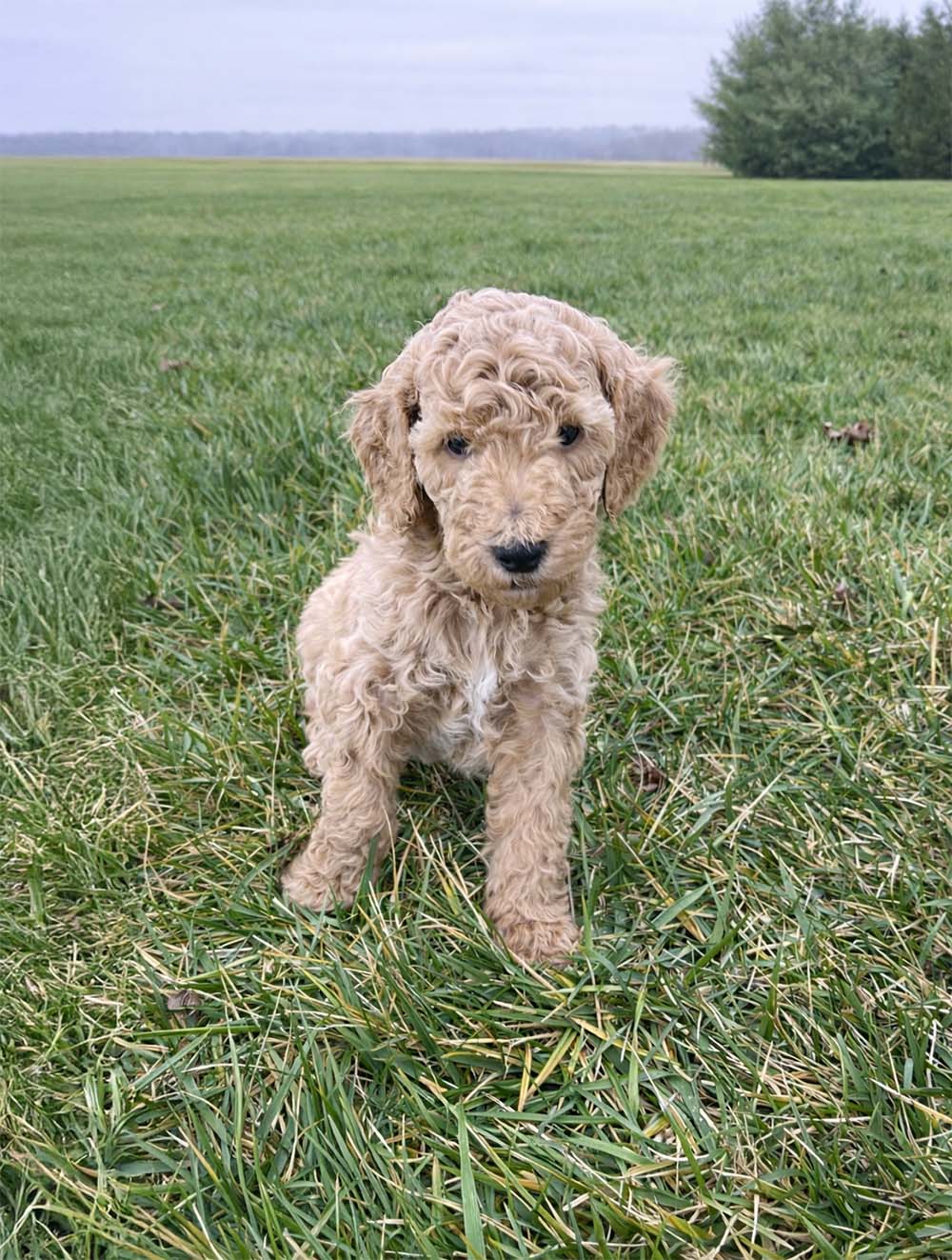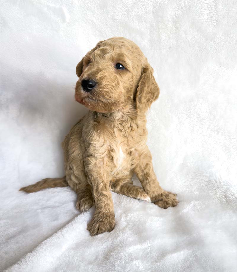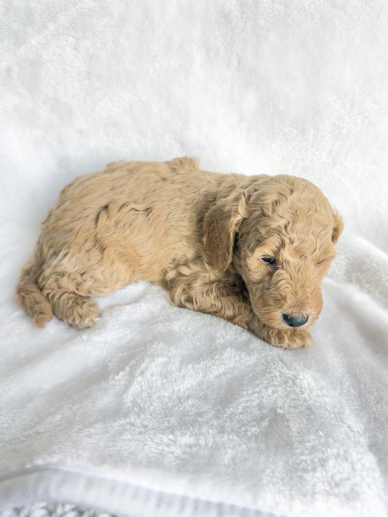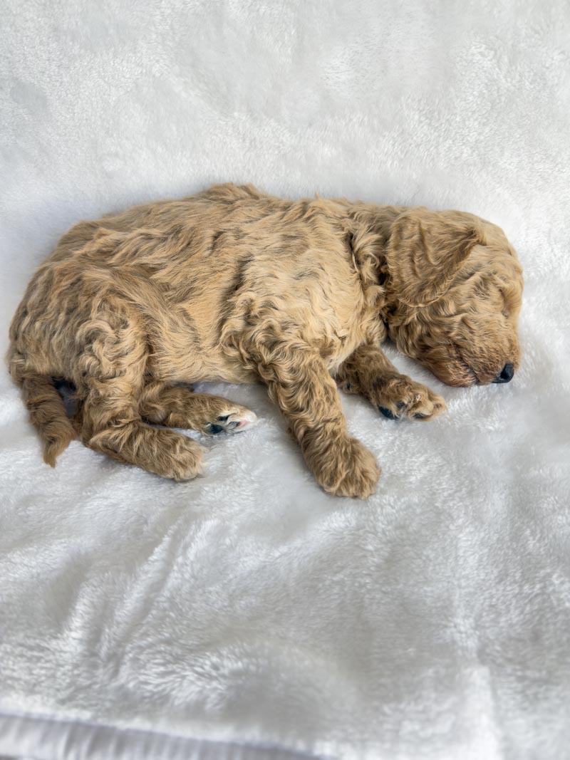 This handsome little boy is 8 weeks old and has a beautiful apricot/tan coat that shines in the light. His fur is already starting to show a soft wave that will continue to develop as he grows, and he has the sweetest newborn features with a tiny black nose, a white streak on his chest, and a relaxed expression. His coloring is rich and even from head to tail, giving him a very classic and striking look.