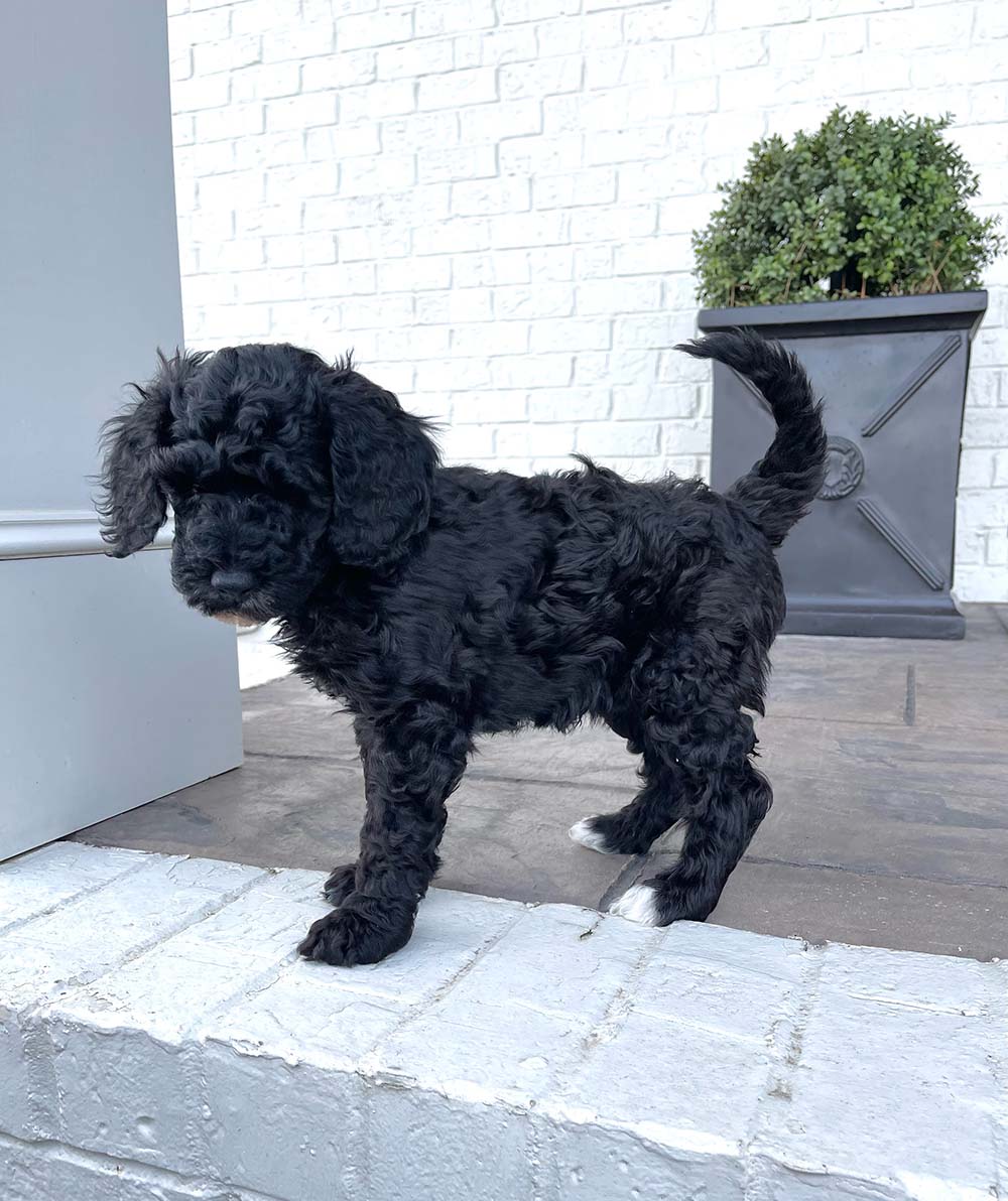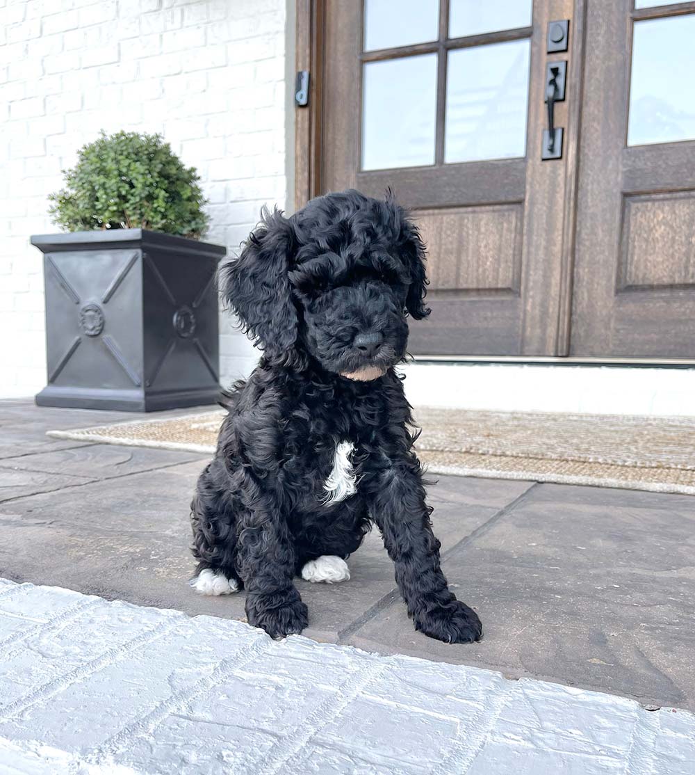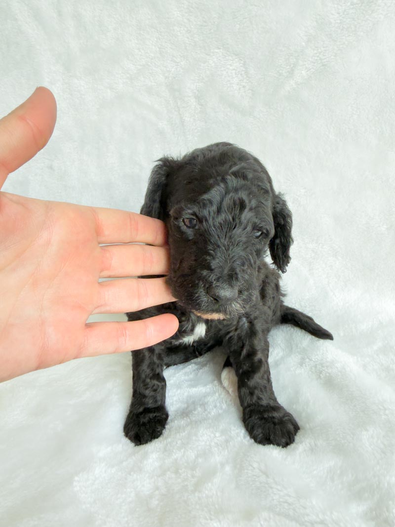 Trusty is growing quickly, and his features are becoming even more beautiful as he matures. He has a rich, solid black coat that shines in the light, now contrasted by more pronounced and beautifully defined white markings on his chest and paws. Those white accents stand out more with each passing week, giving him a stunning, balanced look. His fur continues to develop a soft wave, and his sweet expression, tiny black nose, and relaxed demeanor make him especially endearing.