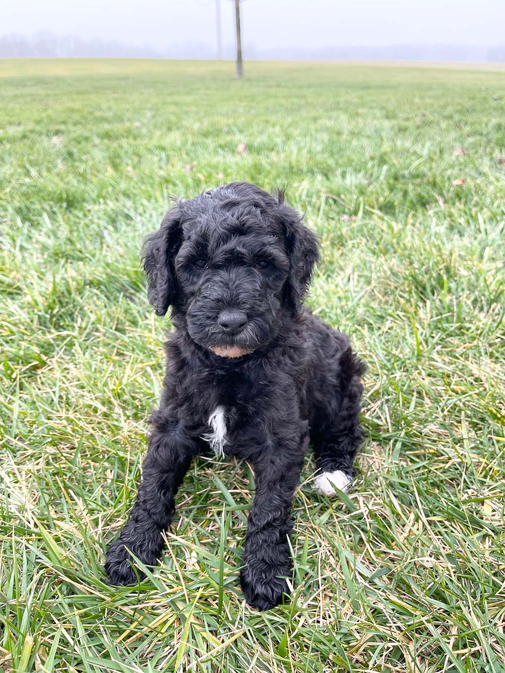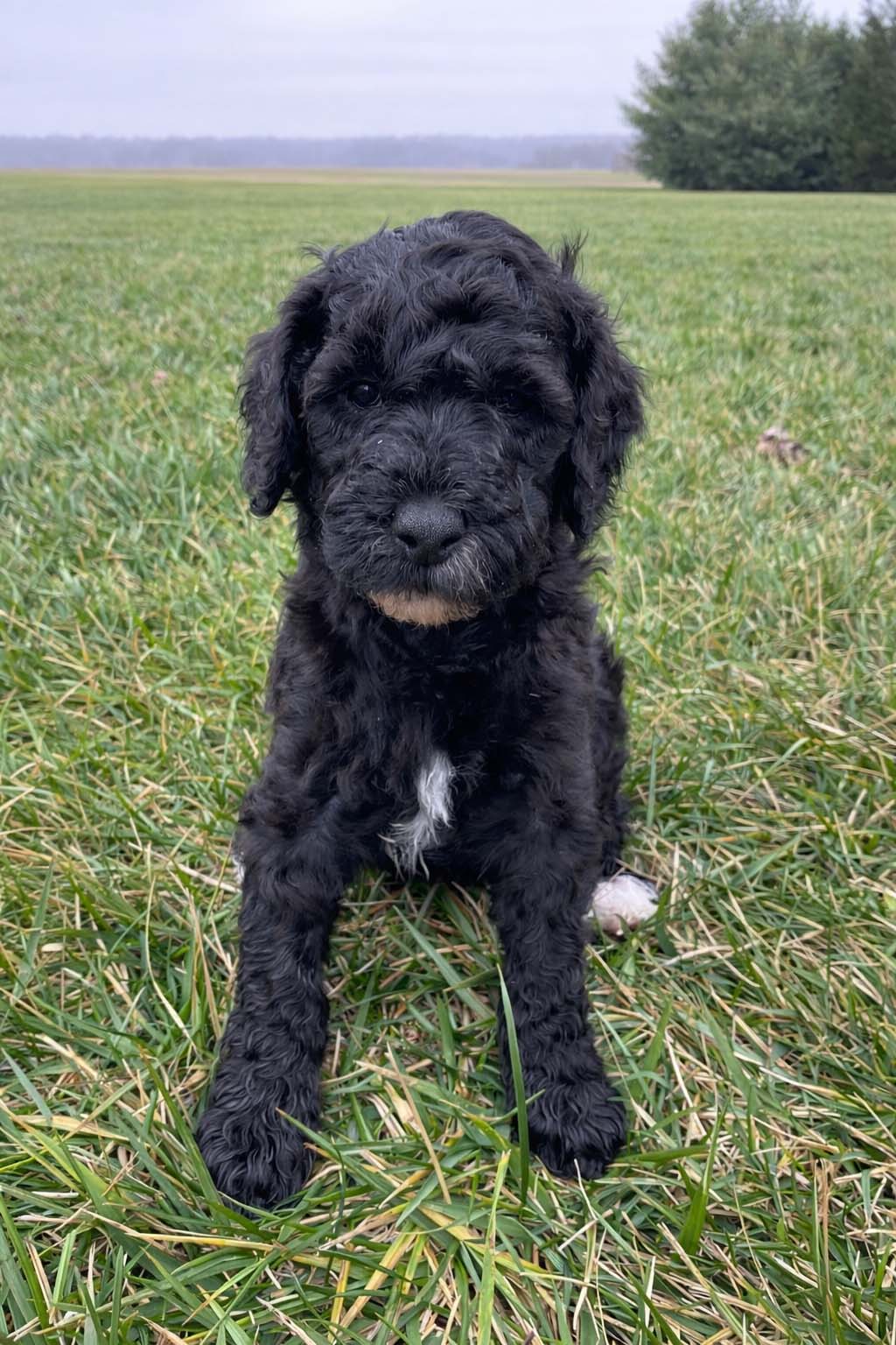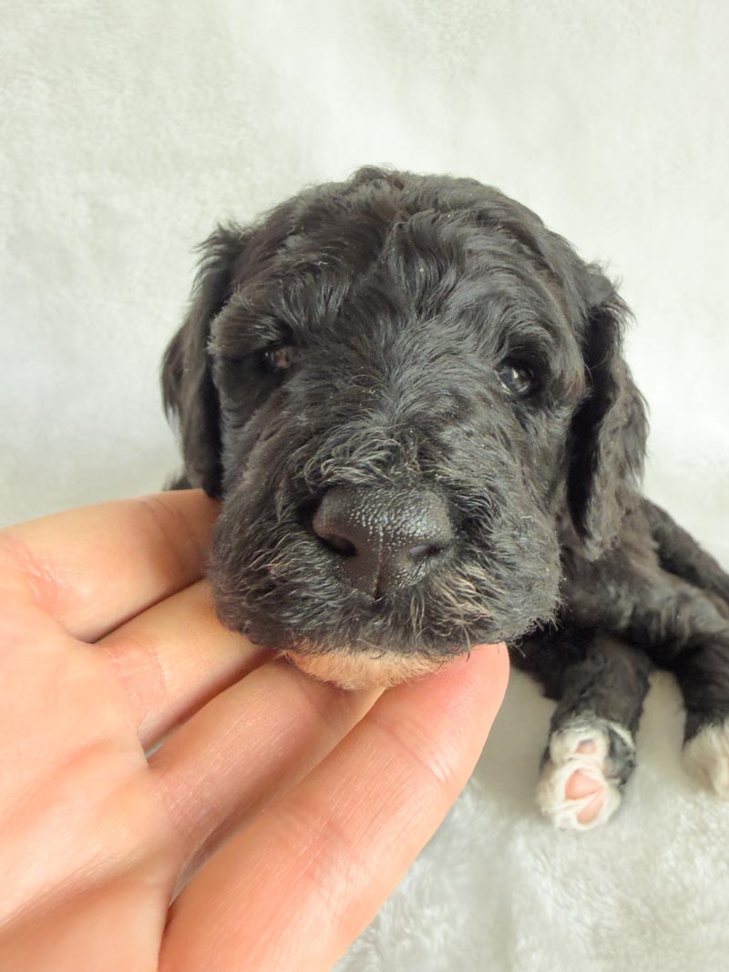 Trusty is growing quickly, and his features are becoming even more beautiful as he matures. He has a rich, solid black coat that shines in the light, now contrasted by more pronounced and beautifully defined white markings on his chest and paws. Those white accents stand out more with each passing week, giving him a stunning, balanced look. His fur continues to develop a soft wave, and his sweet expression, tiny black nose, and relaxed demeanor make him especially endearing.
